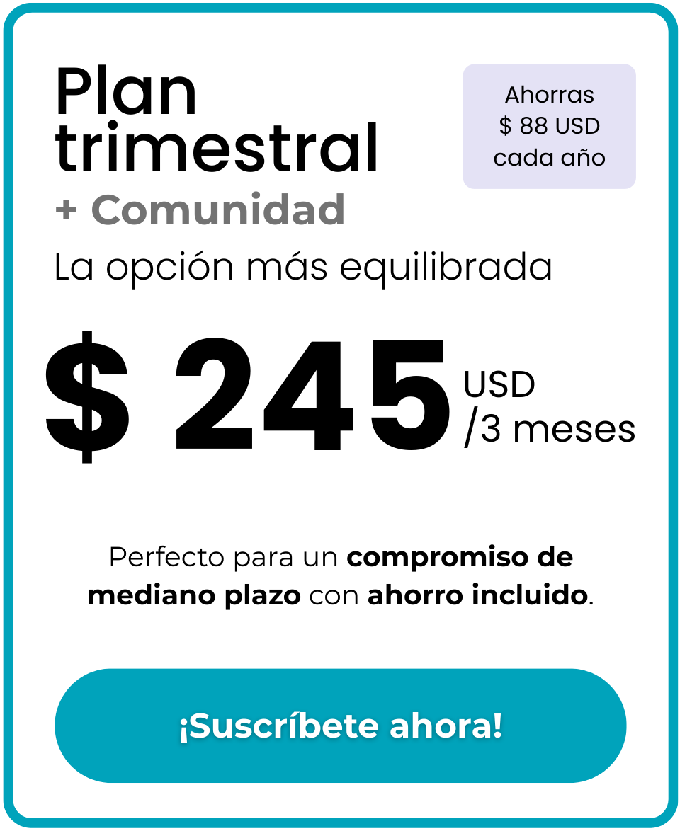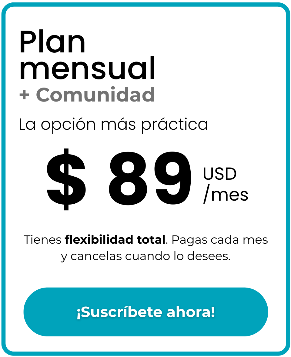 Tienes acceso completo a todo el material mientras mantengas activa tu suscripción. Si decides cancelarla, podrás acceder hasta el final del período que ya pagaste. Cuando reactives tu suscripción, continuarás exactamente donde lo dejaste.