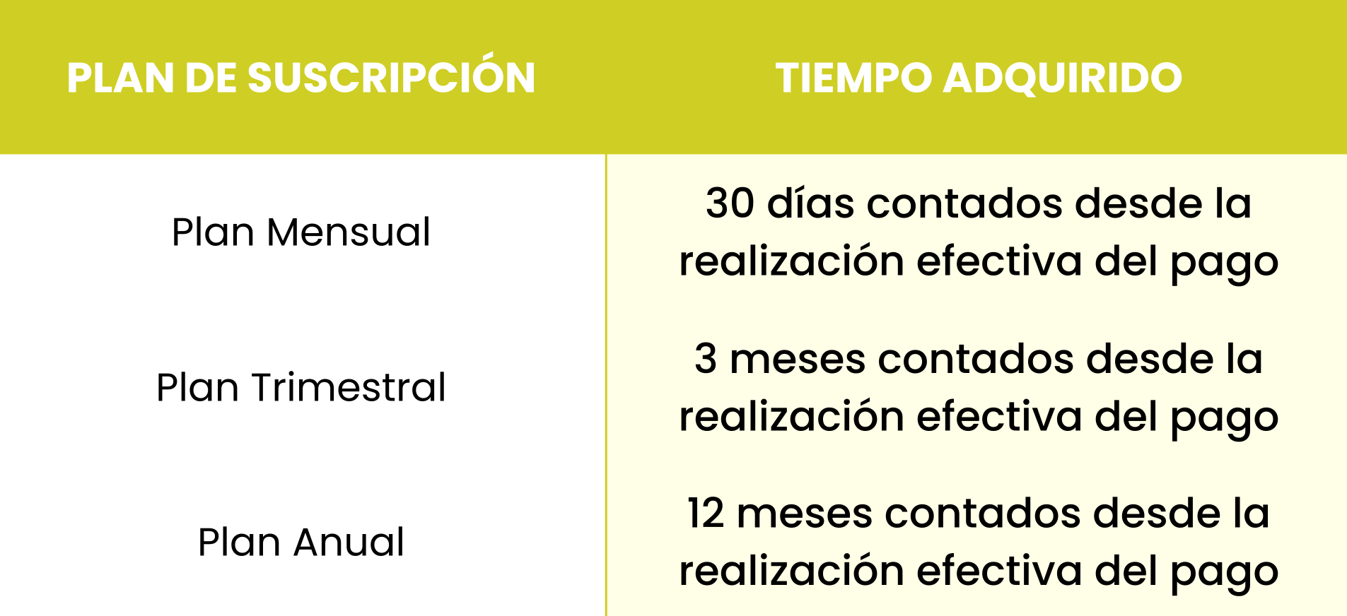 Dependiendo del plan de suscripción al que decidas acceder, tendrás los siguientes tiempos para hacer uso de nuestros contenidos: