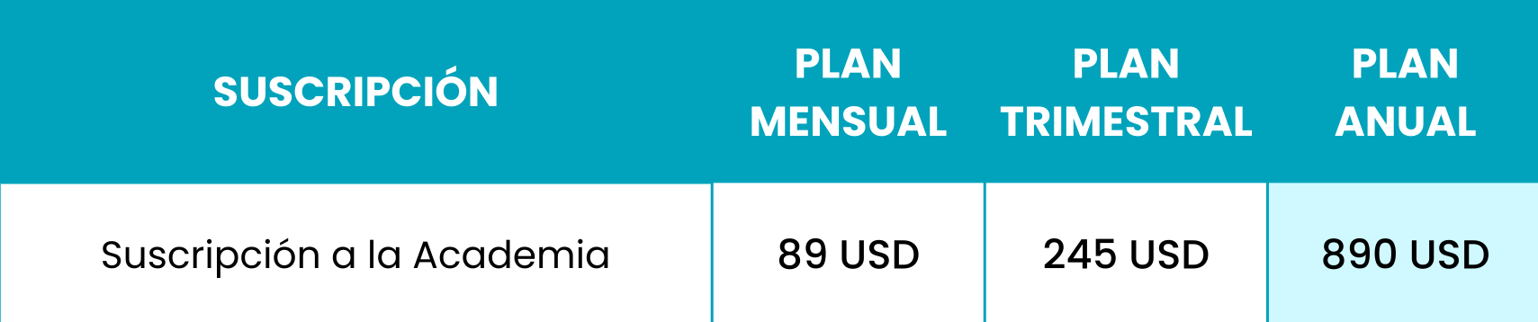 Los planes de suscripción que deberás pagar por acceder a LA ACADEMIA son los siguientes, de acuerdo con el que elijas: